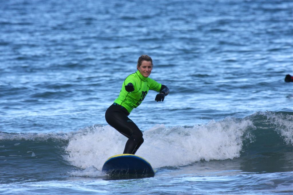 ES: Firstly we meet at the school, where we issue all the equipment. We have separate male and female changing rooms, so no embarrassing moments in front of strange men! Then it’s a short walk down to the beach where we spend approx 25 mins on the beach going though safety, technique, key stages, ocean awareness etc. then it’s into the water to put into practice the technique taught. First lessons are spent in the “white water”, but as clients gain more confidence and experience, then subsequent lessons venture out into the unbroken waves.