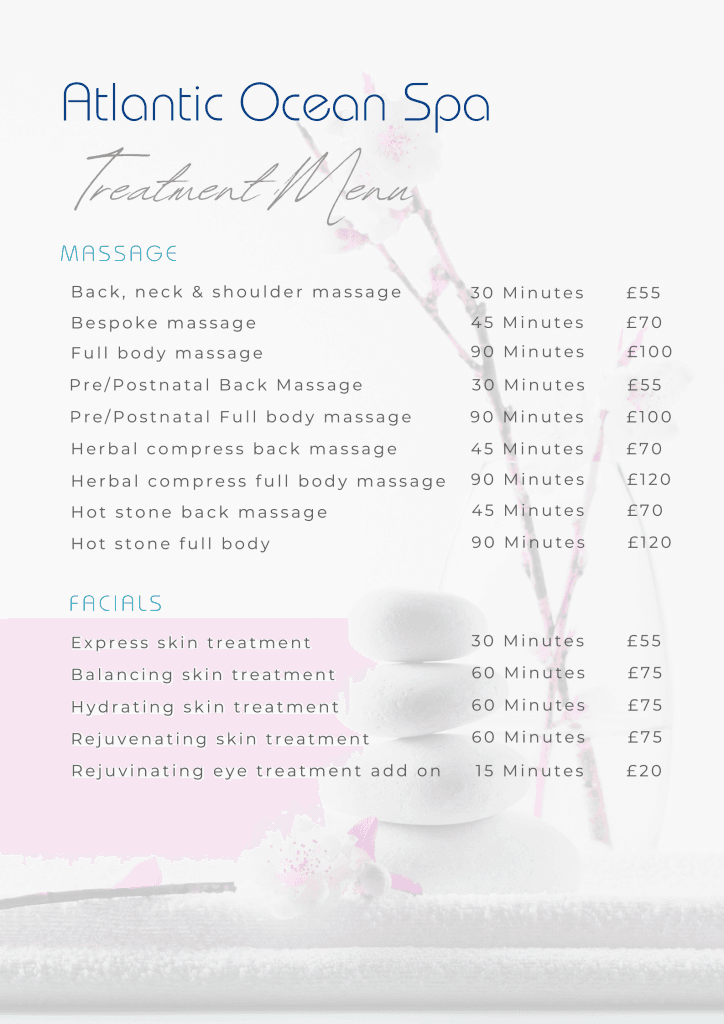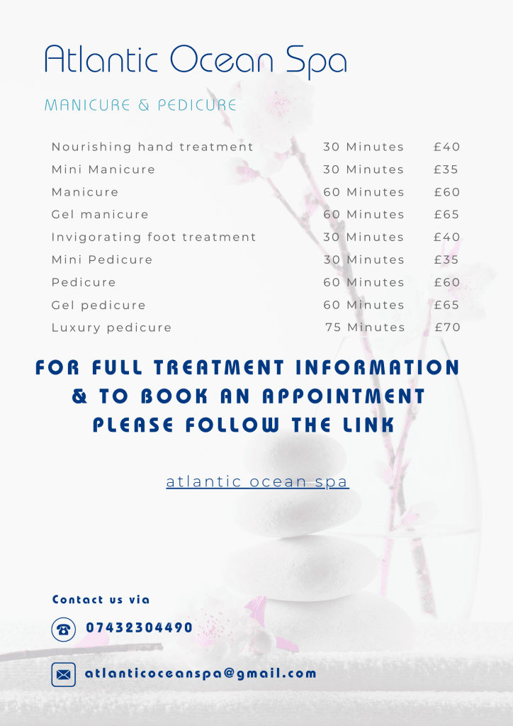 To book a treatment with our spa therapist, visit www.atlanticoceanspa.co.uk where you can view all available treatments, prices and availability.
